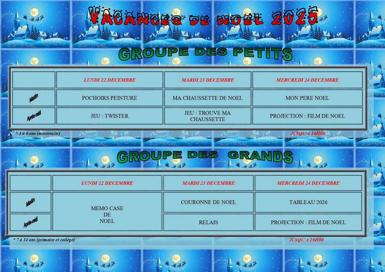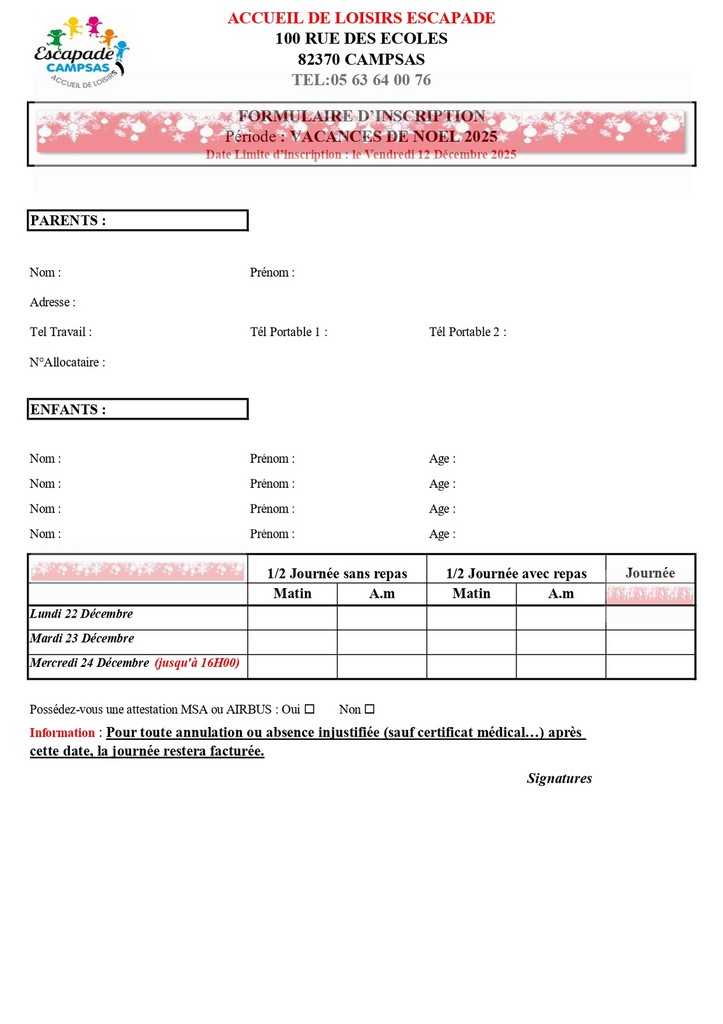 L’Accueil de Loisirs ESCAPADE sera ouvert pendant les Vacances de Noël.